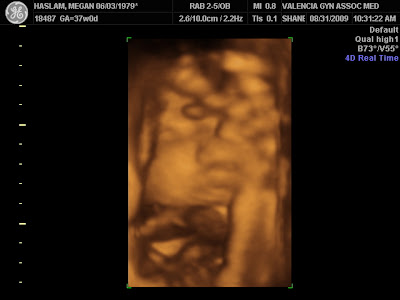 If he stays put for the next three weeks (and there's no sign of him doing anything different), this baby may well be around 9 pounds by the time his due date comes around. I saw some definite chubby cheeks during the ultrasound yesterday.